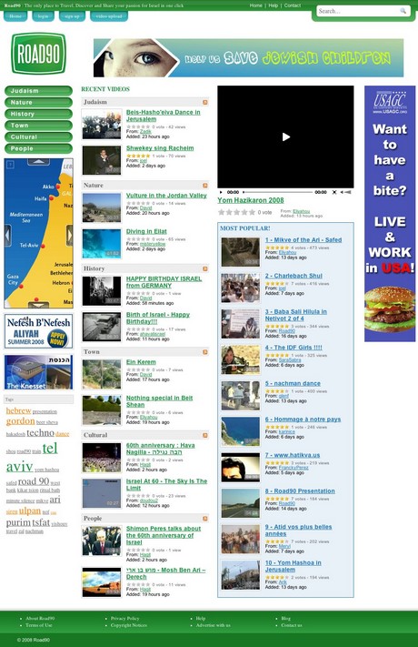 Road90.com è un sito di hosting video che consente all’utente registrato di caricare, condividere e commentare video che riguardano Israele (città, villaggi, natura, giudaismo, aree culturali e storiche…). Ogni video ha un limite massimo di 10 minuti e 100 MB.